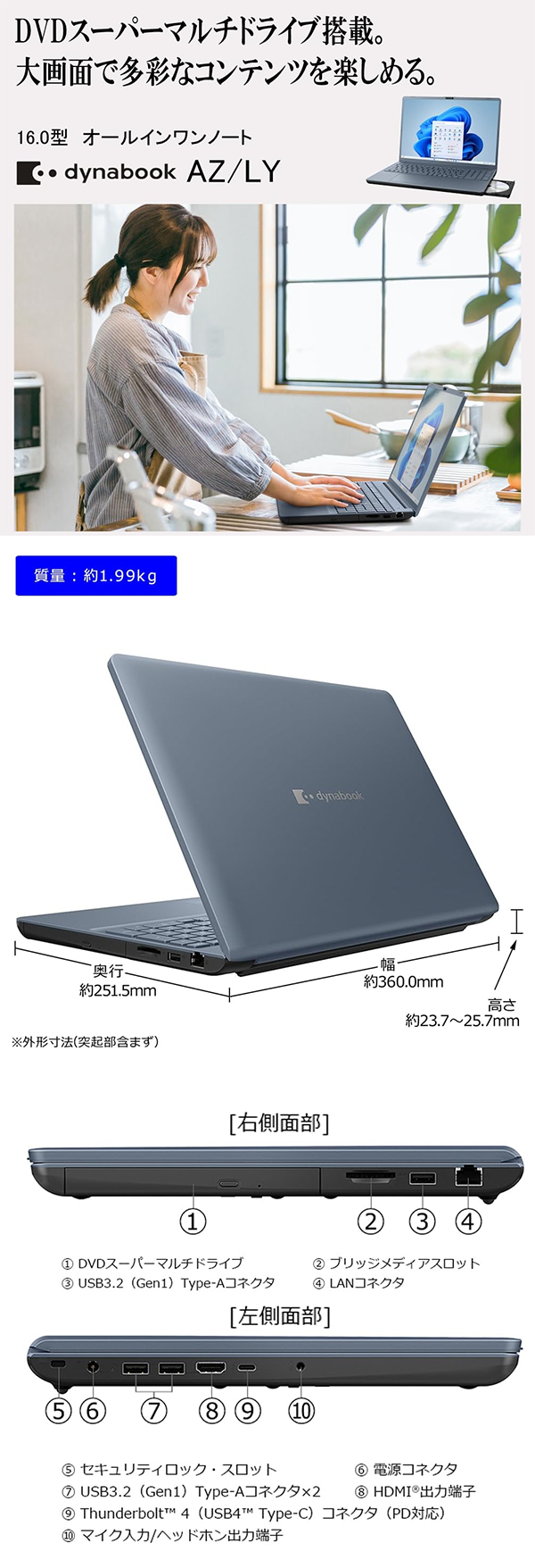Toggle【商品の説明】新品 ノートパソコン PC dynabook AZ/LY 16型 Windows11 CPU Intel 13世代 Core i5-1334U メモリ 16GB SSD 512GB 無線LAN Wi-Fi6 Office Home & Business 2024