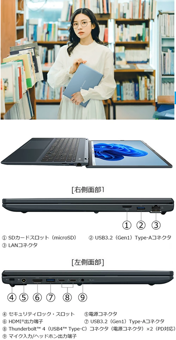 - 16.0型 WUXGA (1,920×1,200)。アスペクト比 16:10 を採用しており、従来の16:9よりも縦の表示領域が広く、ExcelやWeb閲覧の効率が向上します。