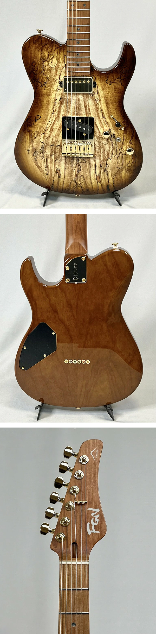 - ボディ: アッシュバックに、独特な木目が際立つスポルテッドメイプルをトップに配した豪華な仕様です。