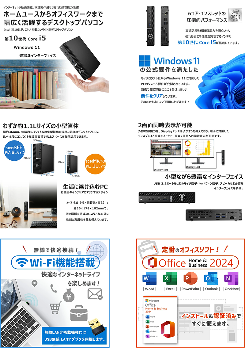 ■注目のおすすめの一台! 中古 ミニデスクトップパソコン PC デル Dell OptiPlex 5080 Micro Windows11 CPU 10世代 Core i5-10500T メモリ 8GB/16GB/32GB SSD 128GB/256GB/512GB/1TB 無線LAN モニター なし 2画面出力 MS Office 2024 H&B