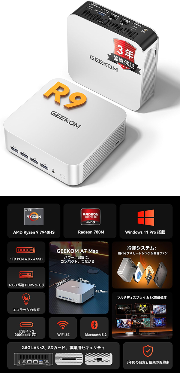 ▶ Amazonのサイト: 新品 ミニデスクトップパソコン PC GEEKOM A7 Max Windows11 CPU AMD Ryzen 9 7940HS メモリ 16GB SSD 1TB 有線LAN 2.5G 無線LAN Wi-Fi6E モニター なし 4画面出力 AI機能