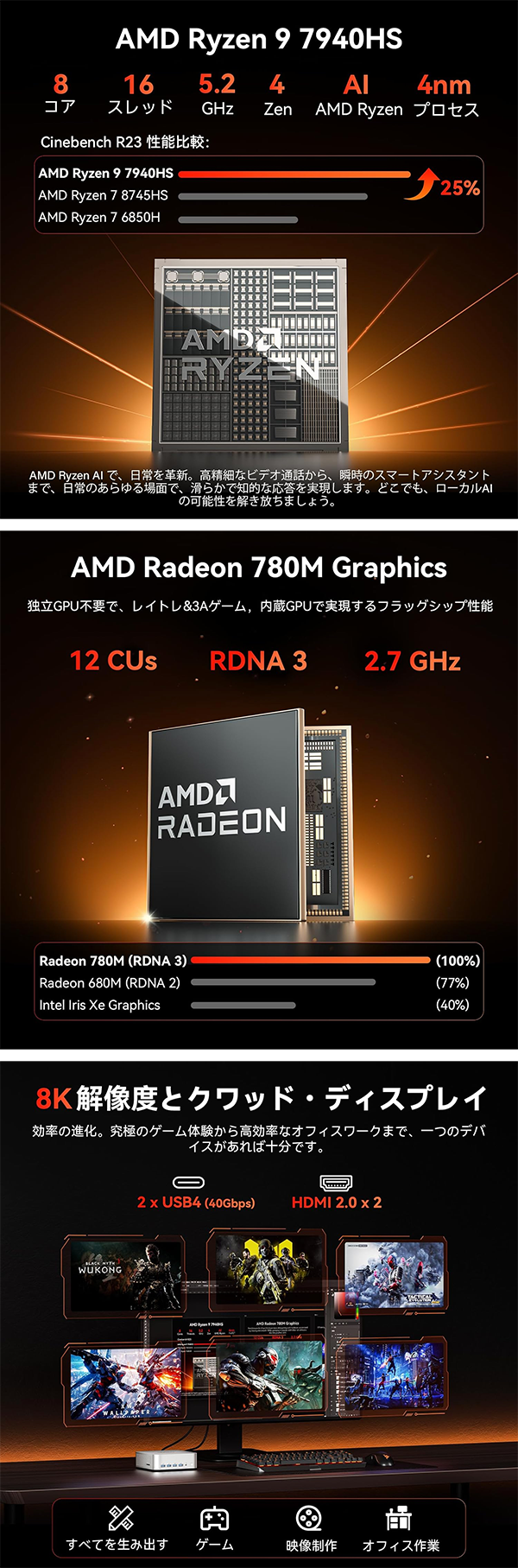 - CPU: AMD Ryzen 9 7940HS (8コア/16スレッド、最大5.2GHz)