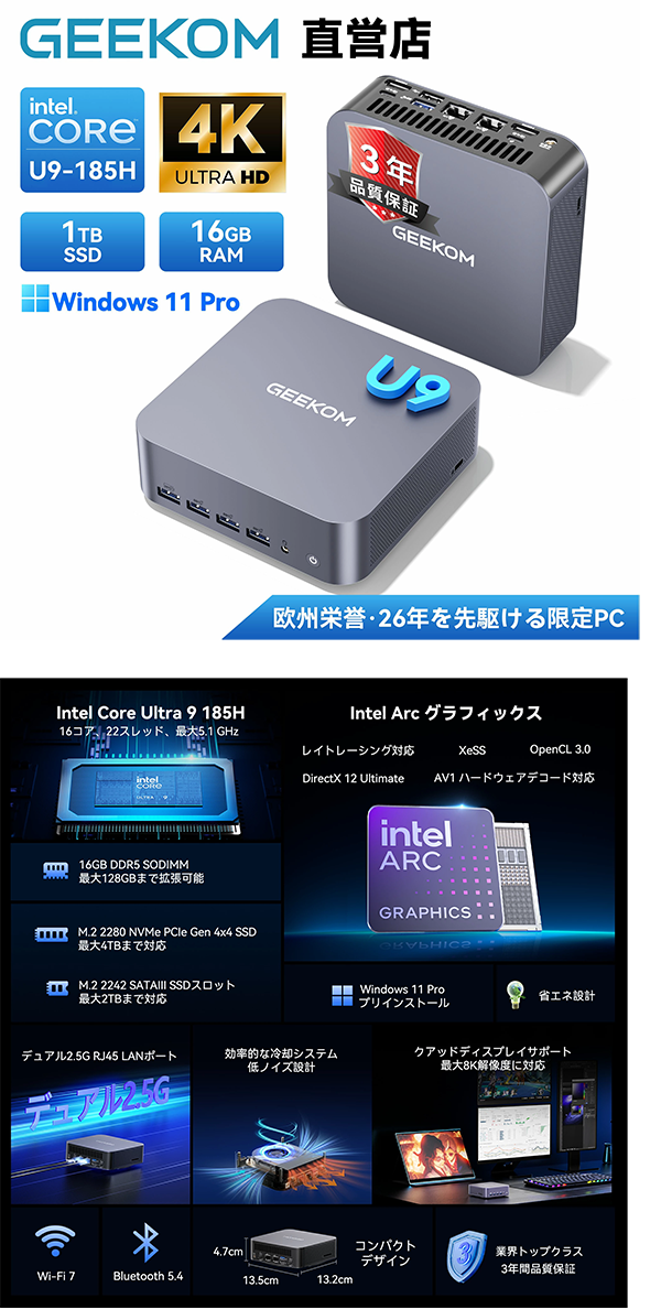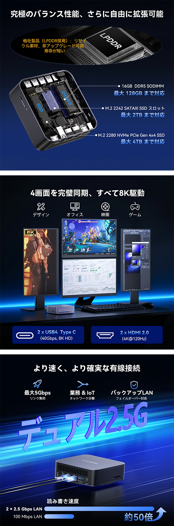 - 通信機能: Wi-Fi 7 / Bluetooth 5.4 / 2.5G 有線LAN×2 (最新の超高速通信規格に対応)