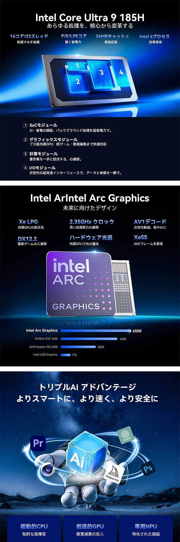 - CPU: Intel Core Ultra 9 185H (AI処理に特化したNPUを内蔵し、高いパフォーマンスと省電力性を両立)