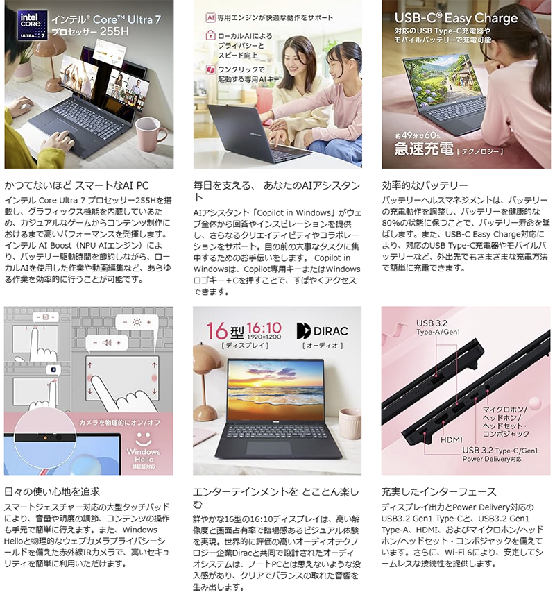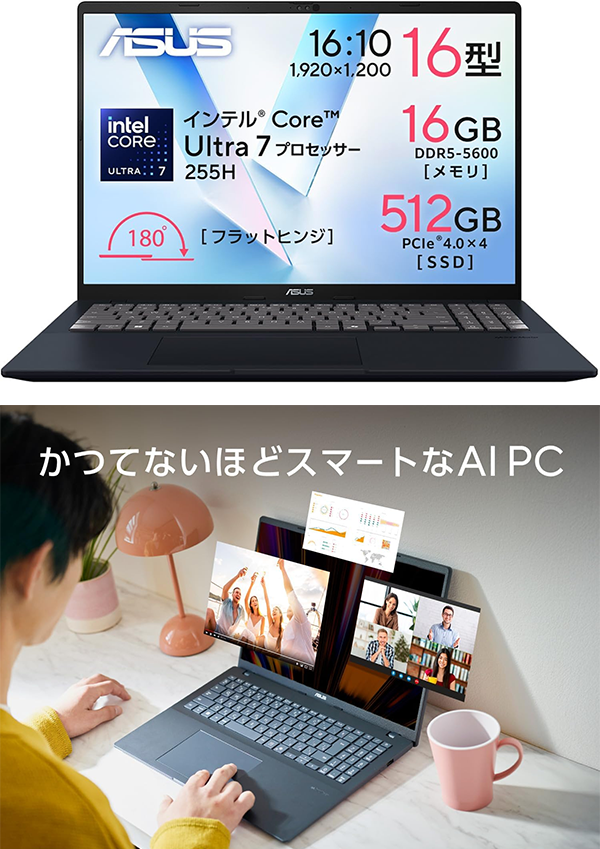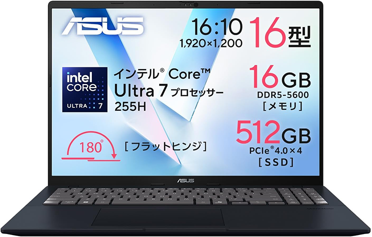 Toggle【商品の説明】新品 ノートパソコン PC ASUS Vivobook 16 X1607CA 16型 Windows11 CPU Core Ultra 7 255U メモリ 16GB SSD 512GB 無線LAN Wi-Fi6 Copilotキー Office なし
