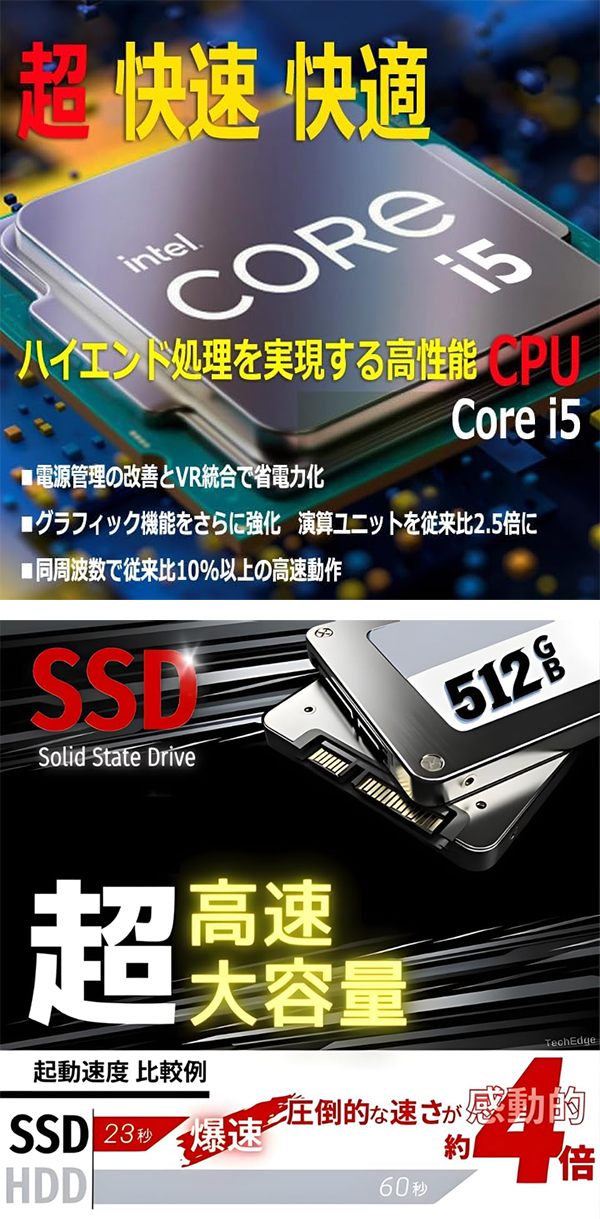 - ストレージ: 512GB SSD (NVMe) により、OSやソフトの起動が非常に高速です。