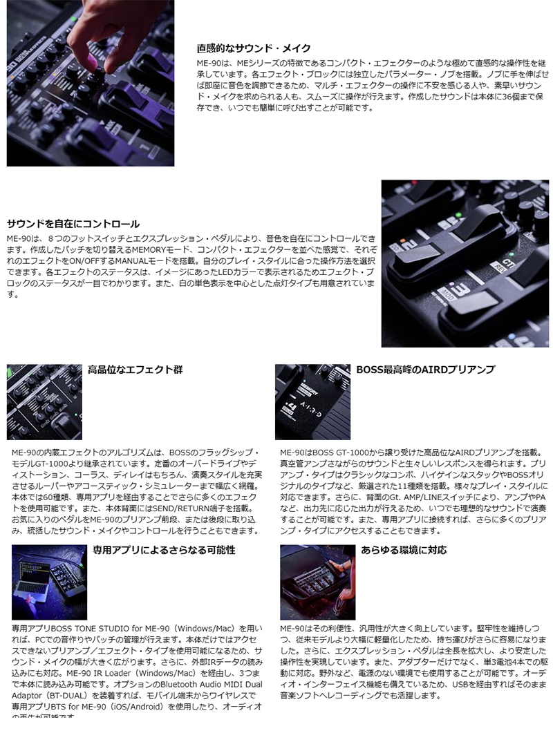 - BOSSのMEシリーズは、軽量かつ堅牢な筐体に充実したパラメーター・ノブとフットスイッチを装備したマルチ・エフェクターです。コンパクト・エフェクターの様なノブ操作による直感的な音作りと、プレイヤーの演奏スタイルに合った柔軟なコントロールを実現します。